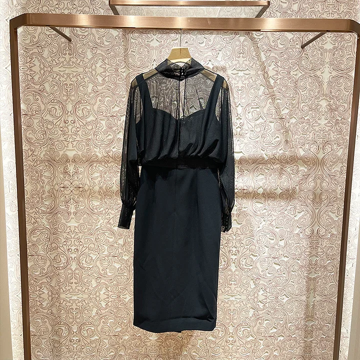 Mesh-collared, high-waisted, patchwork dress
